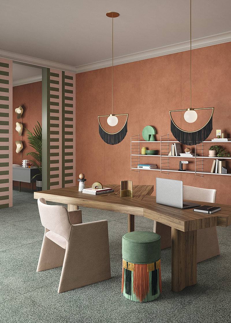 Mit der in Zusammenarbeit mit Ferruccio Laviani entstandenen Serie Pigmenti wird die Keramik zur puren Materie im Dienst der Farbe. Es handelt sich um eine feine Struktur, in der leichte grafische Bewegungen der Farbe Tiefe und Dynamik verleihen. Die 12 Farbvarianten wurden von Laviani entwickelt, der hierfür seine persönliche Sensibilität für besonders ausdrucksvolle und natürliche Farben mit einer methodischen Analyse der Farbtrends in Architektur und Innendesign verbunden hat. Das Ergebnis ist eine Palette aus zeitgemäßen Farbtönen, die an der Natur und zugleich an besonders edlen Nuancen inspiriert und darauf ausgelegt sind, einfach untereinander sowie mit den anderen Kollektionen der Marke kombinierbar zu sein und damit maximale Ausdrucksfreiheit bieten. Die Farbtöne Canyon und Sunset entsprechen beispielsweise ganz dem Apricot Crush-Trend. Pigmenti bildet dank der Technologie Slimtech 3plus eine zweite, keramische Haut aus nur 3,5 mm starken, großformatigen Platten (3x1 m). Sie sind extrem leicht und vor allem vollkommen klimaneutral: Nicht nur, weil sie in der Produktion weniger Rohstoffe, Energie und Wasser erfordern und weniger Kohlenstoffdioxidemissionen und transportbedingte Umweltverschmutzung verursachen, sondern auch, weil mit dem Projekt THINk ZERO die CO2-Restemissionen des gesamten Lebenszyklus des Produkts vollständig kompensiert werden.