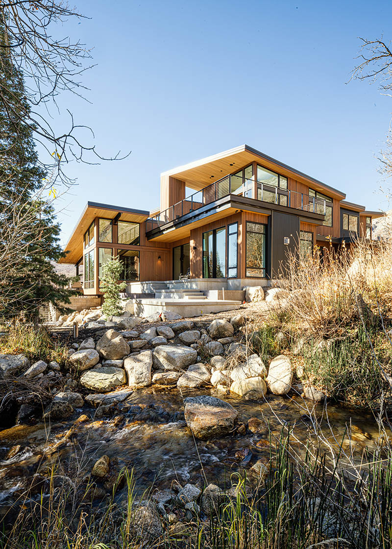 Dieses von Obicua Architecture auf einem außergewöhnlichen Grundstück mit Blick auf einen Bach in Three Falls, Alpine (UTAH), entworfene Wohnhaus wurde als Zufluchtsort fernab des Großstadttrubels konzipiert. Angesichts der spektakulären Umgebung mit einem Espen- und Fichtenwald, einem Bach mit mehreren Wasserfällen und dem Panoramablick wurde das Haus als eine Reihe von Terrassen und Veranden gebaut, die sich der natürlichen Schönheit öffnen.