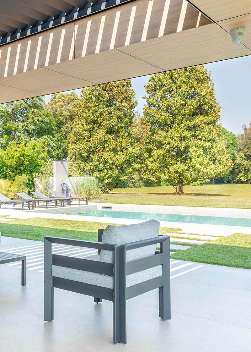 Für die Innen- und Außenböden des Hauses wurden die großformatigen ultradünnen Platten der Kollektion Nextone gewählt. In mehreren Formaten und drei verschiedenen Stärken verfügbar, überträgt diese Kollektion die ästhetische und natürliche Balance von Stein sowohl nach innen als auch nach außen und bietet eine makellose visuelle Kontinuität zwischen Garten und Innenräumen. Der Farbton Next Taupe, ein warmes Grau mit braunen Nuancen, verleiht den Oberflächen eine umhüllende Wärme und elegante Materialität. Für das Badezimmer wurde die Kollektion Noblesse verwendet, eine Auswahl an keramischen Marmorvarianten, inspiriert von den edelsten natürlichen Essenzen, mit lebendigen und innovativen Farben sowie neu kalibrierten klassischen Nuancen. Besonders hervorgehoben wird im Projekt Gray Marble, ein Marmor mit raffinierter und komplexer Textur, der Mineraleinschlüsse von Elfenbein bis Bronze enthält und Wände, Badewanne, Dusche und Waschbecken mit Schönheit verkleidet. Ein Projekt, das Räume neu definiert, um nicht nur Komfort, sondern auch eine tiefe Verbindung mit der Natur zu bieten.