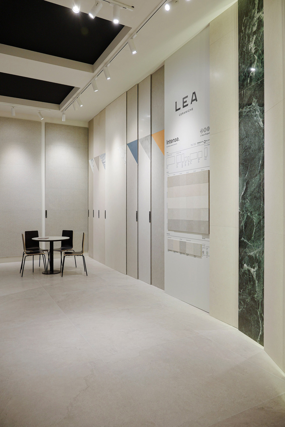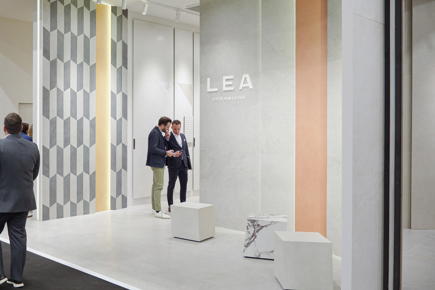 Rund um diese beiden Kollektionen zeigte der Messestand einen der charakteristischsten Codes von Lea Ceramiche: den Dialog zwischen Oberflächen, Oberflächenbearbeitungen und materiellen Ausdrucksformen. Pulse und Intense wurden zusammen mit Pigmenti, entworfen von Ferruccio Laviani, und Noblesse präsentiert – in einer kompositorischen Erzählung, die die Ausrichtung der Marke auf mix & match hervorhob.