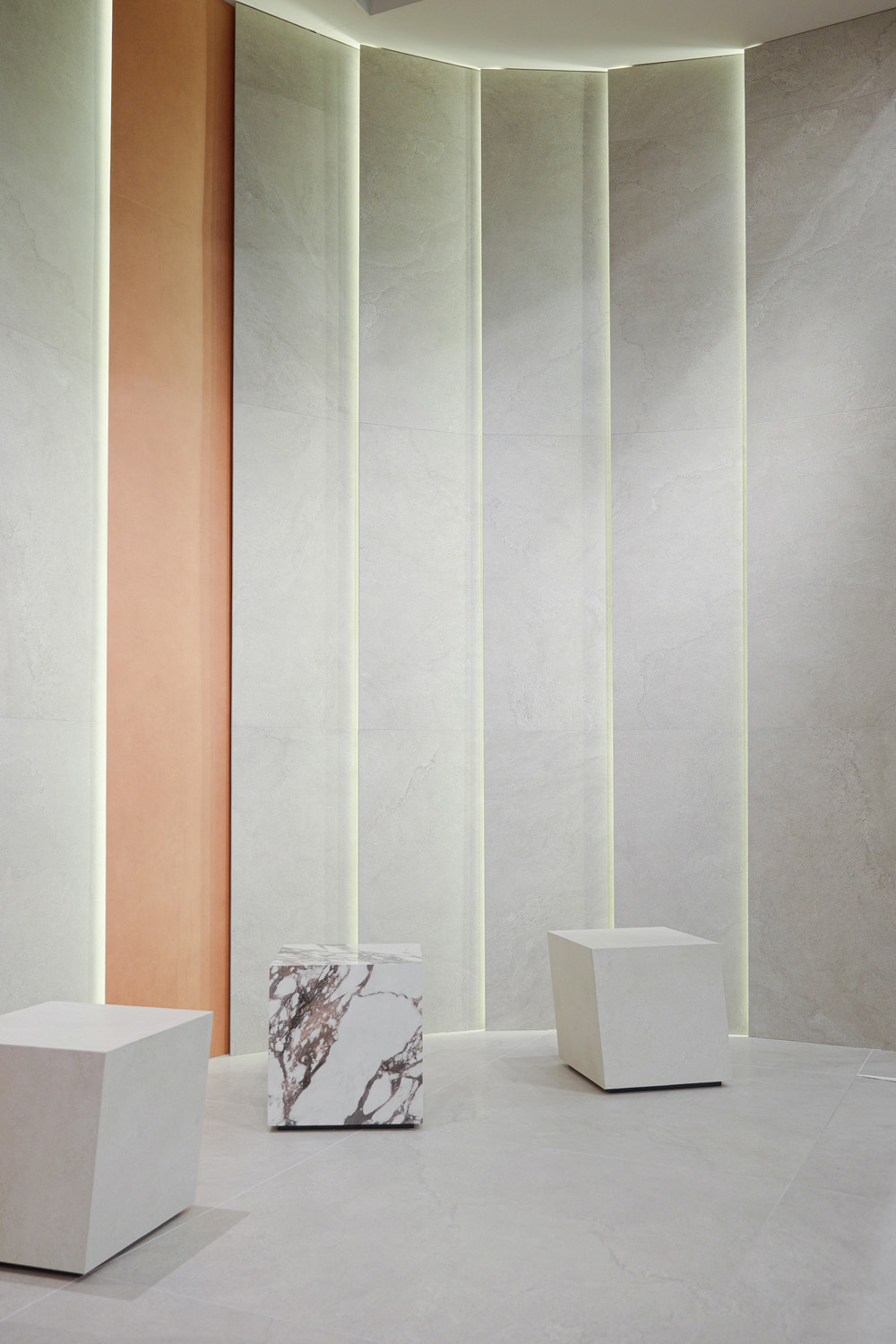 Abgerundet wurde das Konzept durch das 3-Tech Project, ein exklusives System, das dieselbe materielle Identität über drei unterschiedliche Stärken und verschiedene Produktionstechnologien hinweg entwickelt und so Kontinuität zwischen Bodenbelägen, Wandverkleidungen und Außenanwendungen schafft.