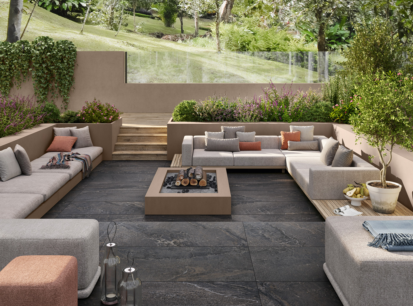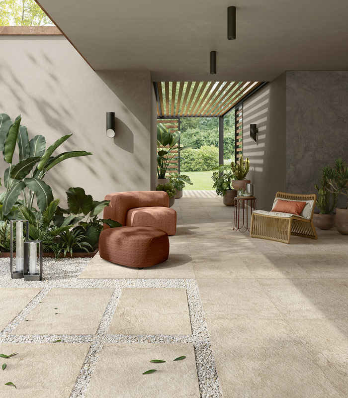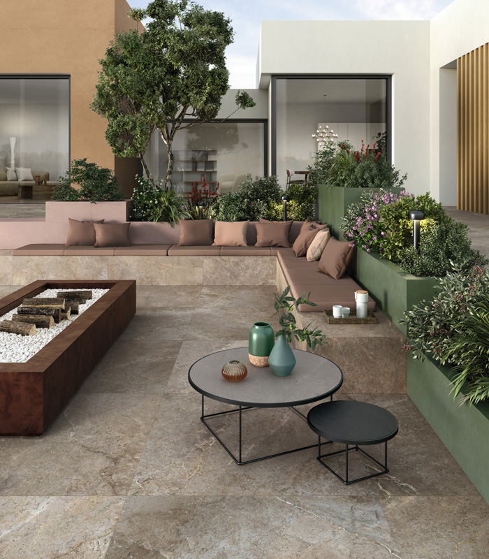 Im zeitgenössischen Design wird der Außenbereich nicht mehr als separater Raum betrachtet, sondern als eine Dimension, die zunehmend in das architektonische Projekt integriert ist. Terrassen, Patios, Balkone und Gärten verwandeln sich in strukturierte Bereiche, in denen Boden- und Wandbeläge für den Außenbereich aus Feinsteinzeug mit derselben Sorgfalt wie Innenräume geplant werden.