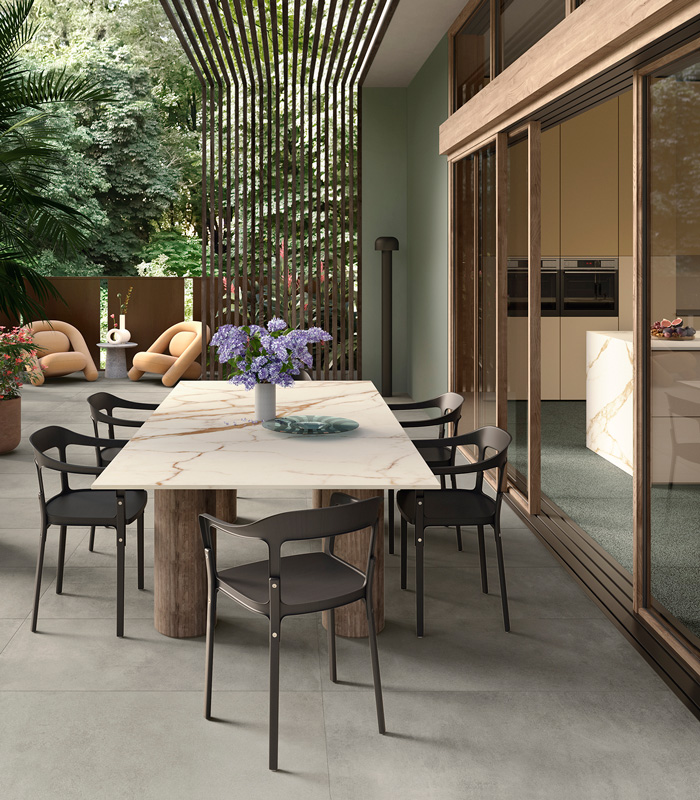 Mit Masterpiece durchdringt Design die Räume und verbindet Innen- und Außenbereiche mit signierten Oberflächen von starkem architektonischem Charakter, entstanden aus der Zusammenarbeit zwischen der Marke aus Fiorano und Ferruccio Laviani. Die Oberflächen gehen über die reine Verkleidung hinaus und werden zu einem aktiven Bestandteil des Projekts, im perfekten Dialog mit der Tischplatte in Marmoroptik aus der Kollektion Noblesse – Ausdruck einer fortschrittlichen Nutzung von Keramik für zeitloses Design, auch im Außenbereich.