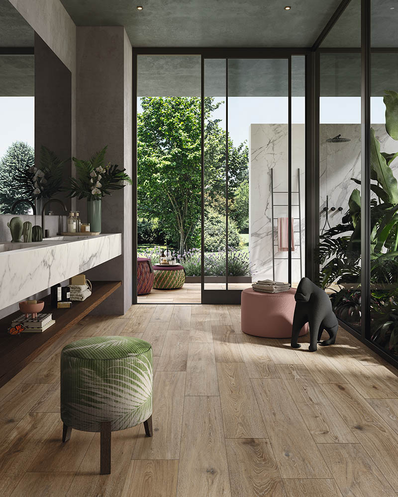 Die Kollektion ist die ideale Wahl für Bäder, die in Dialog mit dem Außenraum treten, dank ihrer materiellen Präsenz und der Fähigkeit, sich mühelos mit anderen Ausdrucksformen zu verbinden. Besonders eindrucksvoll ist die Kombination mit der marmornen Eleganz von Slimtech Noblesse, zum Beispiel als Verkleidung von Möbelstücken.
