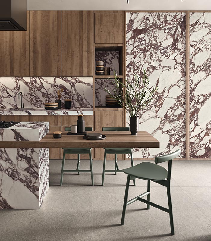 Die Integration großer Platten, ultradünner Oberflächen und weiterentwickelter Materialpaletten ermöglicht heute die Gestaltung von Räumen, die geprägt sind von: