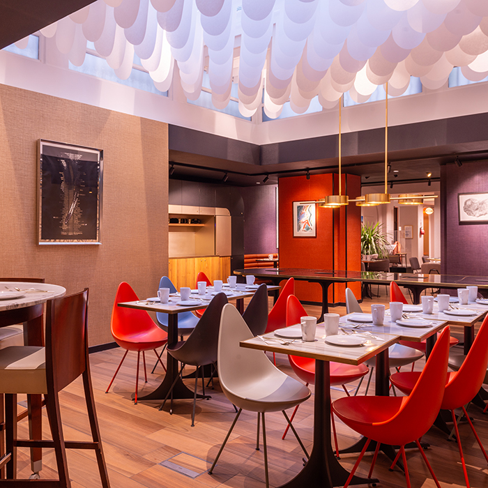 Der Rezeptionsbereich wird von der Kollektion Slimtech Type 32 von Diego Grandi ins Rampenlicht gerückt. Sie zeichnet sich durch die Überlagerung von zwei Schichten aus - einer plastischen Schicht, die auf die Holzart verweist, und einer grafischen Schicht, die auf der Oberfläche den typischen Zickzack-Effekt, eine Anspielung auf den traditionellen französischen Fischgrät-Boden, schafft. Das Resultat ist ein Spiel aus Linien und Mustern, die perfekt miteinander kombinierbar sind, und eine potenziell unendliche Fläche erzeugen.