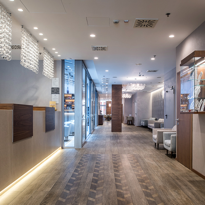 Schließlich, im Herzen von Budapest, nur wenige Meter von der Donau entfernt, liegt das erste Boutique Hotel der Stadt, eröffnet 2006. Mit den jüngsten Renovierungsarbeiten hat der gesamte Bereich im Zeichen der Geselligkeit, Lobby und Speisesaal, auch dank der Bodenmaterialien von Lea Ceramiche eine intime Atmosphäre bekommen. Die Auswahl der Kollektion Slimtech Wood-Stock, ein hauchdünnes Feinsteinzeug mit Holzoptik mit langen Elementen und unterschiedlichen grafischen Designs (in 20 x 200 cm Modulen verlegt) hat das Ambiente aufgewertet und ein langlebiges Ergebnis garantiert. Die Stärke von nur 5,5mm hat zudem eine schnelle Verlegung auf dem bestehenden Boden ermöglicht, der somit nicht entfernt werden musste. So konnte auch während der Umbauarbeiten der volle Betrieb des Hotels garantiert werden.