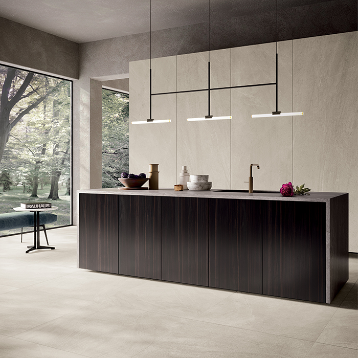 Kontinuität und Sauberkeit der Oberflächen, vertikal und horizontal – monolithische Wände und Böden, die die Umgebungen erweitern – Einrichtungsgegenstände: Concreto, in der Slimtech-Version, entfaltet die unendlichen Möglichkeiten von großen Platten aus dünnem Feinsteinzeug. Und zu den Andeutungen von Zement überlagern die dekorativen Ergänzungen Fragmente von Gold und unvorhersehbare Spuren eines lebenswichtigen Elements wie Wasser, in seiner natürlichen und organischen Interaktion mit dem Material. Die Dekorationen der Serie Zoom mit traditionellen Stärken hingegen tauchen in die organische Natur des Zements selbst ein, legen unvorhersehbare natürliche Geometrien frei und verwandeln sie in grafische Teppiche oder in eine neue Interpretation der traditionellen Zementfliesen, die als Verkleidung eingefügt werden.Nextone hingegen ist eine Lösung mit Steineffekt, die in drei Produktionstechnologien und ebenso viele Stärken untergliedert ist: ein Dekorsystem voller Ressourcen, mit einer Serie von Formaten, Farben und Dekoren, die in der Lage sind, sich mit jeder der Küche gewidmeten Projekttypologie zu messen. Die vier Farben der Kollektion bringen neutrale Farbtöne zum Ausdruck, vom strahlenden White zum hellen Gray, vom gemütlichen Taupe zum eleganten Dark, einem Anthrazit mit einem Hauch von Braun.