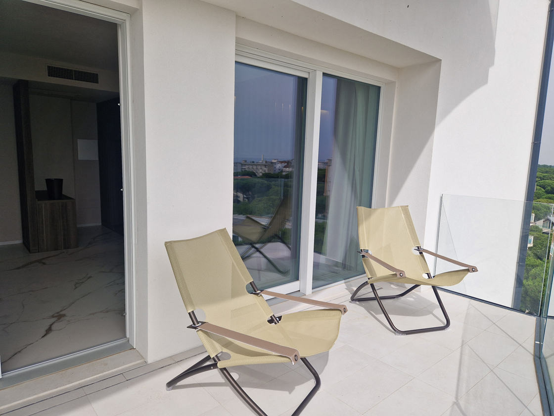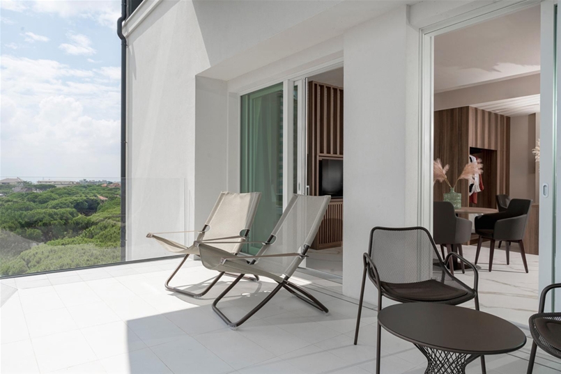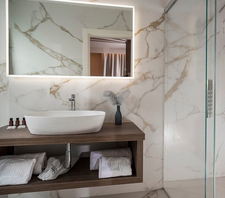 Die Balkone der Suiten sind hingegen mit der natürlichen Kollektion Masterpiece – Master White ausgeführt, die das Gesamtbild mit einem essenziellen und zeitgenössischen Ton abrundet, im Einklang mit den geschwungenen Linien der Fassaden. In jedem Raum werden die Oberflächen von Lea Ceramiche zu einem integralen Bestandteil der Architektur: ein Dialog zwischen Design und Technologie, der den Raum in ein Erlebnis zeitlosen Wohlbefindens und zeitloser Schönheit verwandelt.