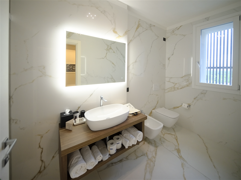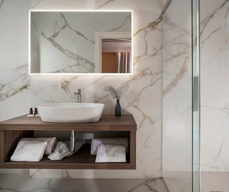Die Oberflächen von Lea Ceramiche definieren die materielle und sensorische Identität des Projekts und begleiten jeden Raum mit Texturen und Oberflächen, die Eleganz, Kohärenz und Komfort ausdrücken. Im Innenbereich sind die Suiten und Bäder mit der Kollektion Noblesse – Calacatta Oro gestaltet, in der natürlichen Version für die Böden und der polierten Version für die Wandverkleidungen: ein helles und anspruchsvolles Keramikmarmor, das die Raumwahrnehmung und die Lichtqualität verstärkt.