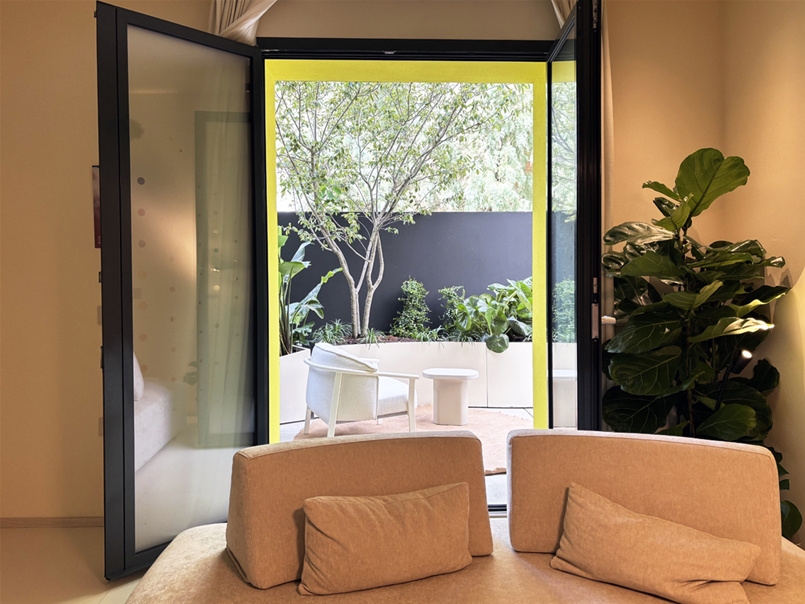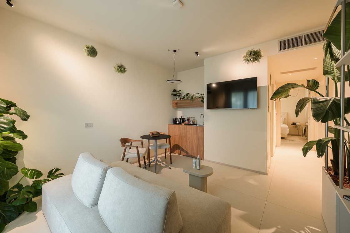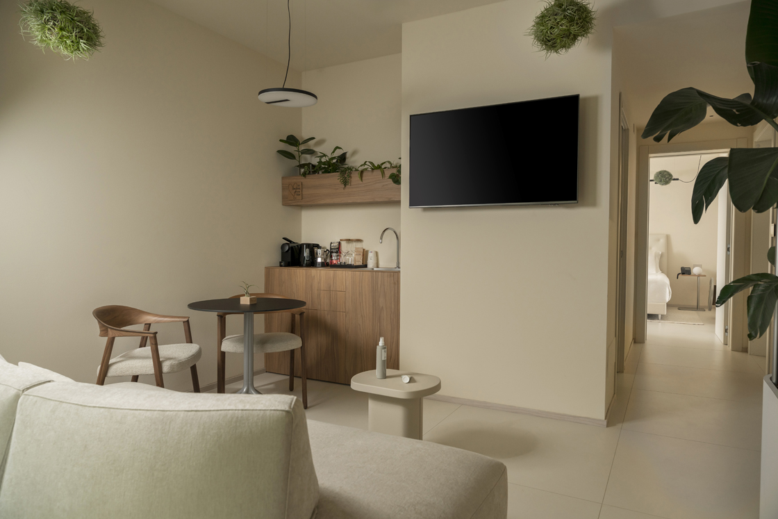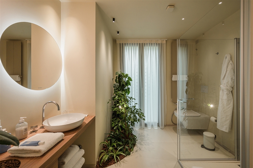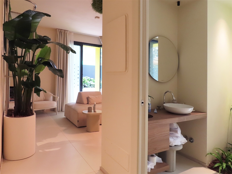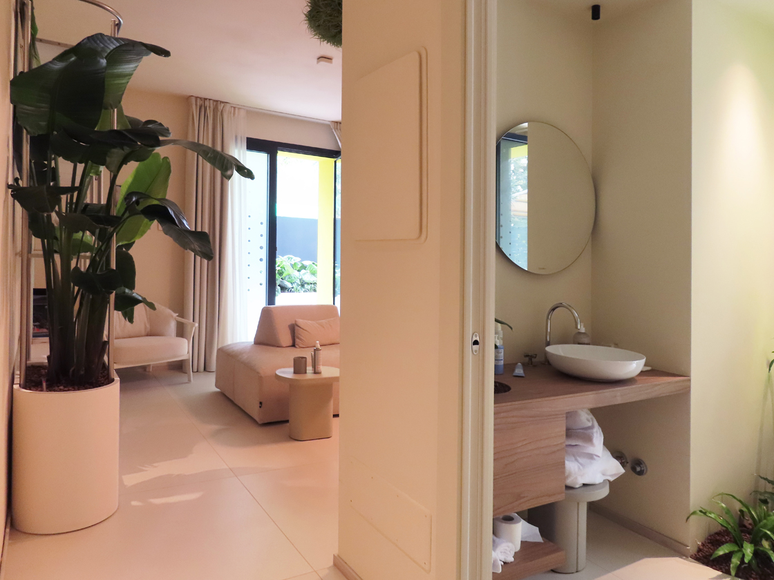 Die Garden Suite verkörpert auf exemplarische Weise die Philosophie des MODE Eco Mood Hotel: gelebte Nachhaltigkeit, bewusste Materialauswahl und hohe Wohnqualität. In diesem Gleichgewicht garantieren die Lea Ceramiche Oberflächen — beide in Zusammenarbeit mit Ferruccio Laviani entwickelt — nicht nur Leistungsfähigkeit und Beständigkeit, sondern tragen maßgeblich dazu bei, einem Raum mit unverwechselbarem Charakter Gestalt zu verleihen, in dem Natur und Architektur zu einem zeitgenössischen Wohlfühlerlebnis verschmelzen.