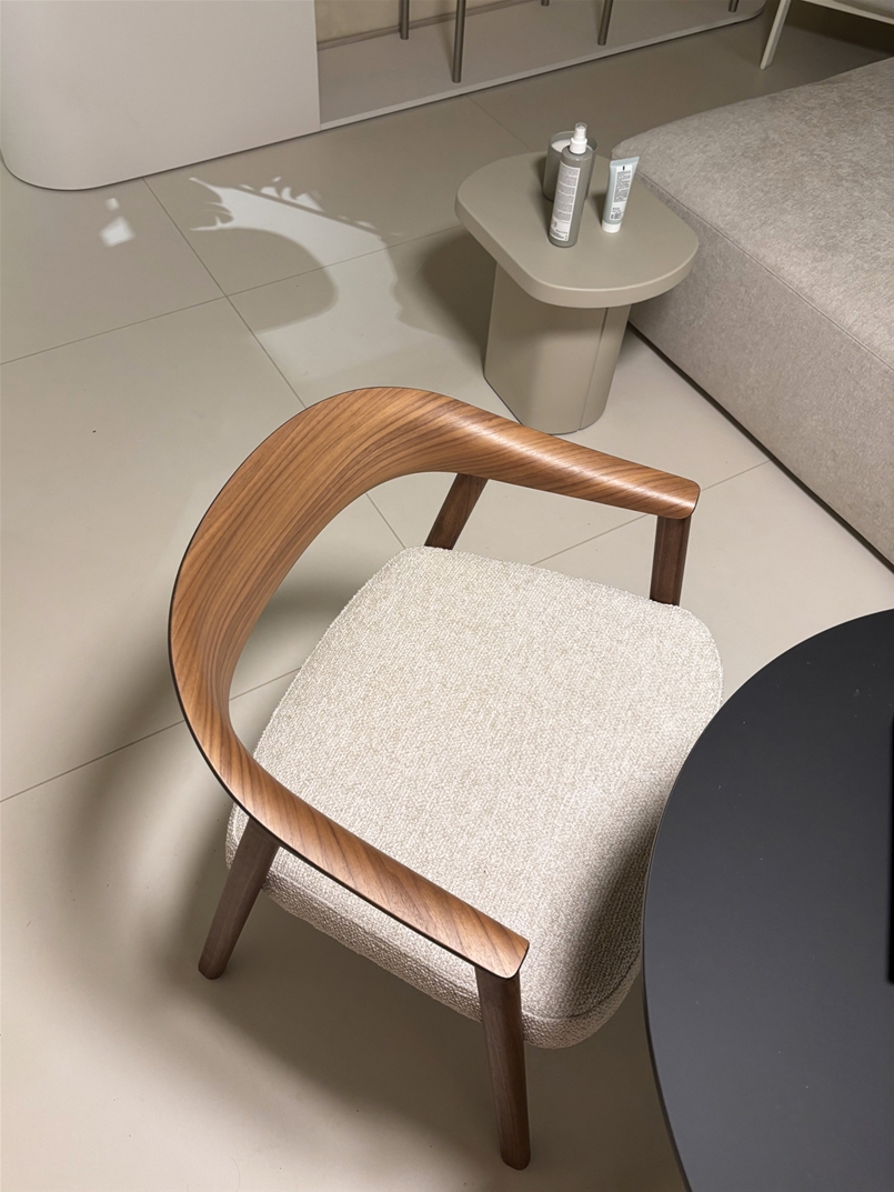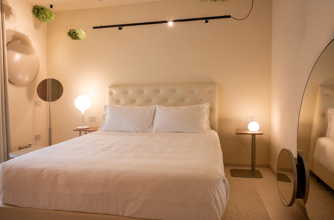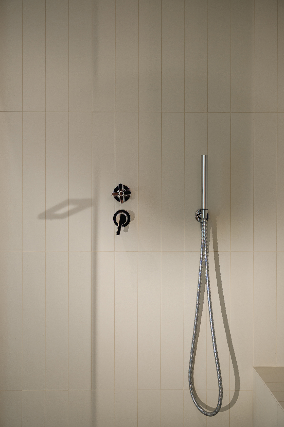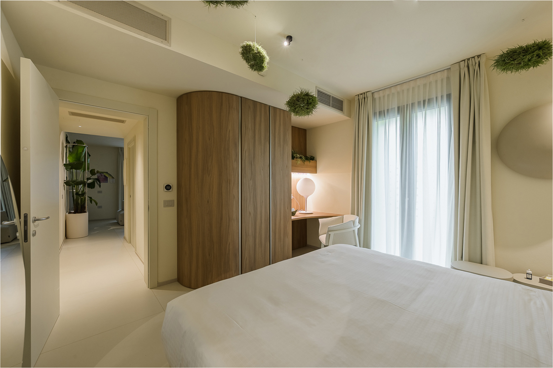Im Inneren hüllt eine ruhige und lichtdurchflutete Atmosphäre die Suite ein, die durch die mit Pigmenti verkleideten Böden in der Farbgebung Chalk und im Format 100×100 cm unterstrichen wird: eine Oberfläche mit weicher Textur, die das natürliche Licht verstärkt und eine zeitgemäße Interpretation des keramischen Materials vermittelt. Im Badezimmer wird der Duschbereich durch das Listello 25 in derselben Nuance gerahmt, das einen klaren und zurückhaltenden Rhythmus einführt und die Innenraumpalette mit Eleganz und vollständiger gestalterischer Kohärenz abschließt.