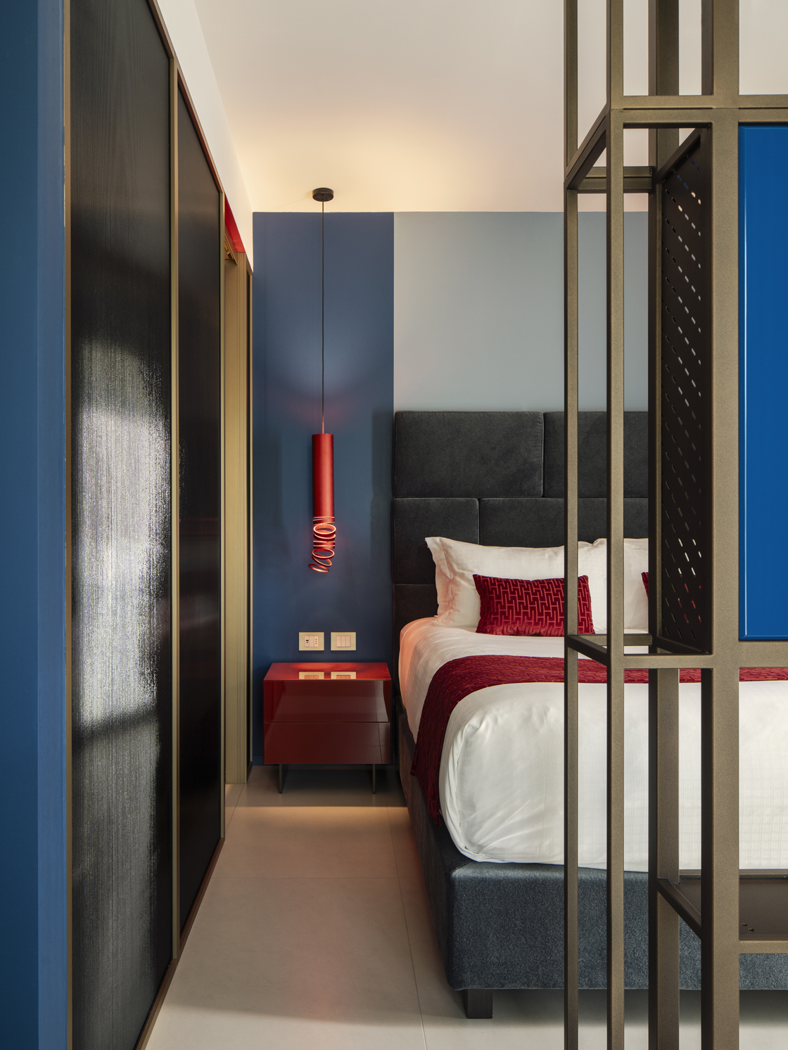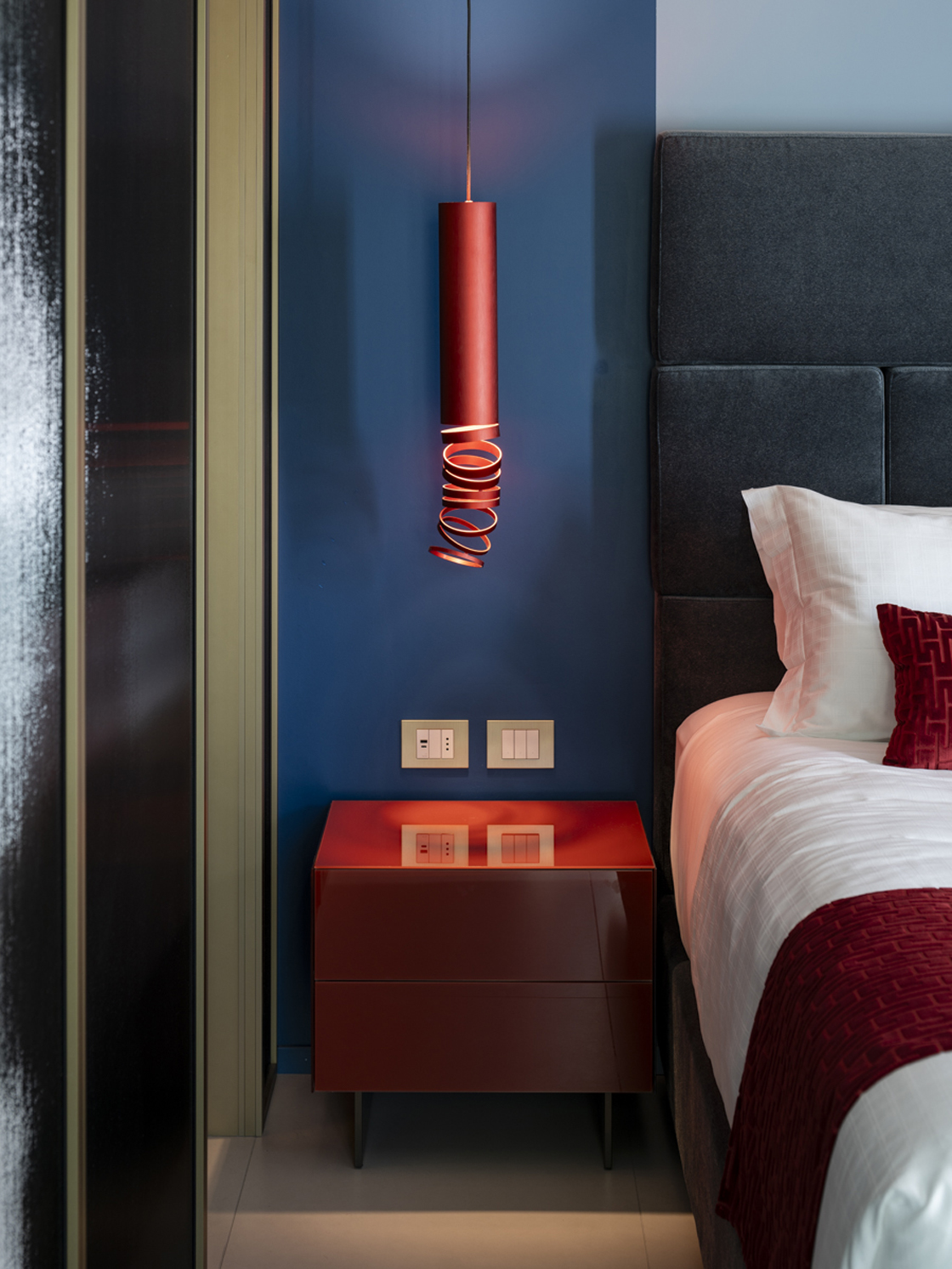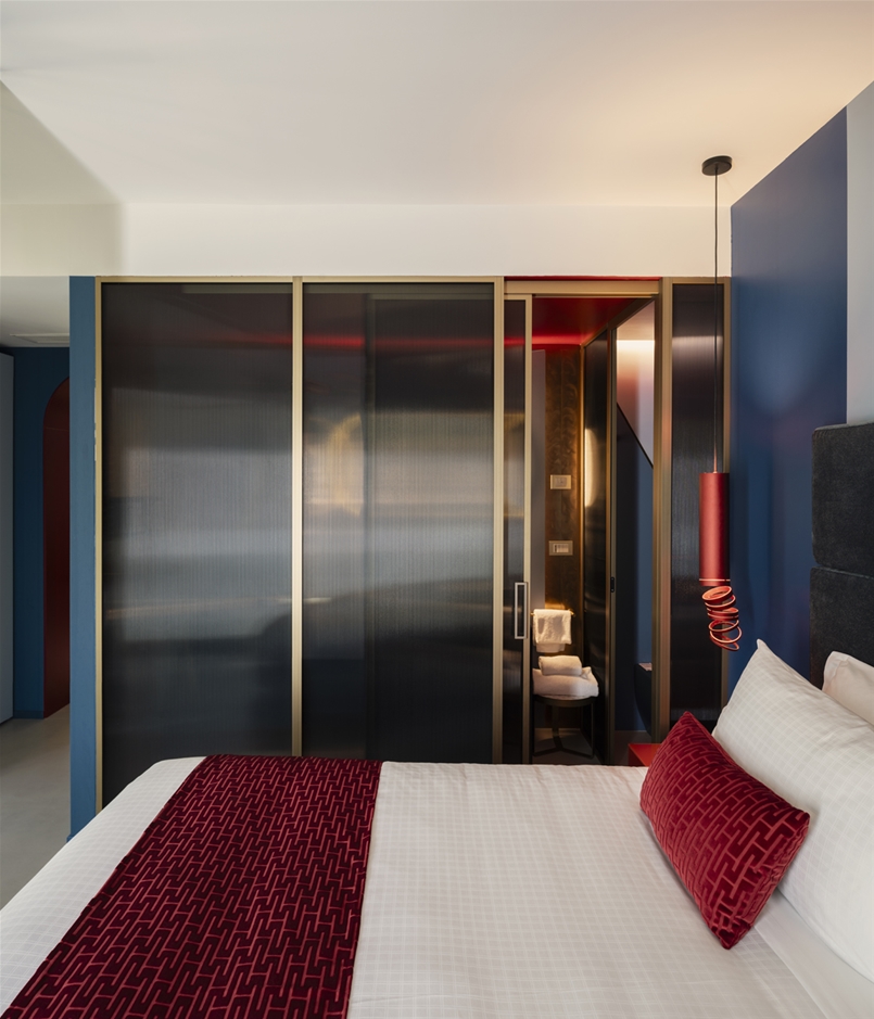 Eine lebendige Palette, die die emotionale Dimension der Suite verstärkt und die fellinische Identität des Projekts in Architektur übersetzt.